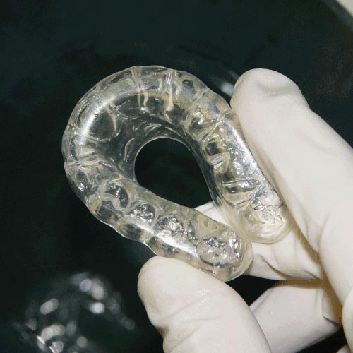 Talon or CLEARsplints is best known as the instant-fit nightguard. The soft thermoplastic resin is unlike any other nightguard on the market because of its acceptance to acrylic and its unique transforming features. The Talon or CLEARsplints resin becomes soft and pliable when placed in hot water before insertion, but at in-mouth temperature, the Talon or CLEARsplints hardens like a traditional hard nightguard. The Talon or CLEARsplintss soft nature allows the appliance to form securely and comfortably to the patient’s mouth, virtually eliminating any need for adjustments. No more wasted time modifying tight spots. After the initial insertion, it is not necessary to insert the Talon or CLEARsplints in hot water unless a refit is necessary. The result is a durable, retentive, and comfortable nightguard delivered in a fraction of the usual chair-time. The Talon or CLEARsplints nightguard is a perfect solution that any patient will appreciate.